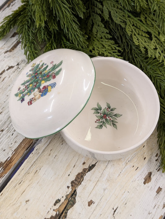 A vintage Nikko Fine China Christmas trinket box with a tree motif.
