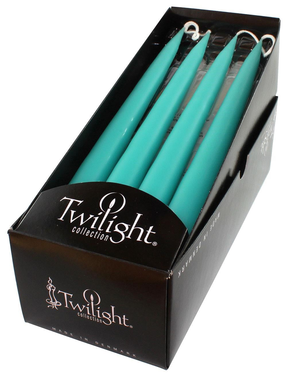 Twilight Collection Danish Taper Candles - 10"x 3/4" - hand-dipped in Denmark using the only the highest quality paraffin and 100% cotton wicks available. Dripless, smokeless and simply the world's finest candles. Non-scented, hypo-allergenic and burn about 1" per hour. 6 pair (12 candles) packaged in a display box.
