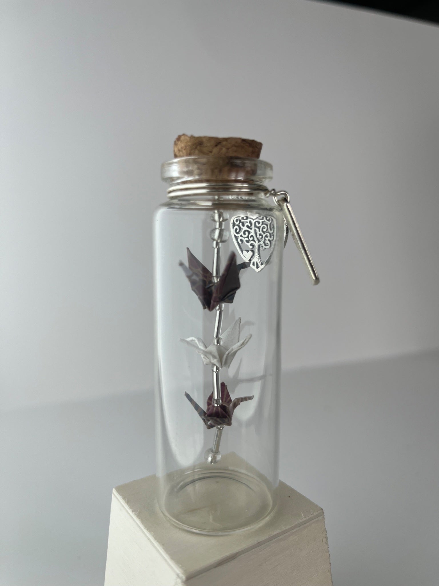 The Celestial Flight bottle is a handmade miniature keepsake that captures a moment of hope and freedom in flight. Encased in a glass bottle just 3.25" tall, three intricately folded origami cranes beaded one above the other appear to hover together effortlessly. Adorned with silver-toned hope and tree of life charms, this piece symbolizes harmony, hope, and timeless connection. Each element is thoughtfully crafted and assembled by hand, making every bottle a unique gift or personal treasure. Perfect as a meaningful keepsake, a token of encouragement, or a charming accent for any space.