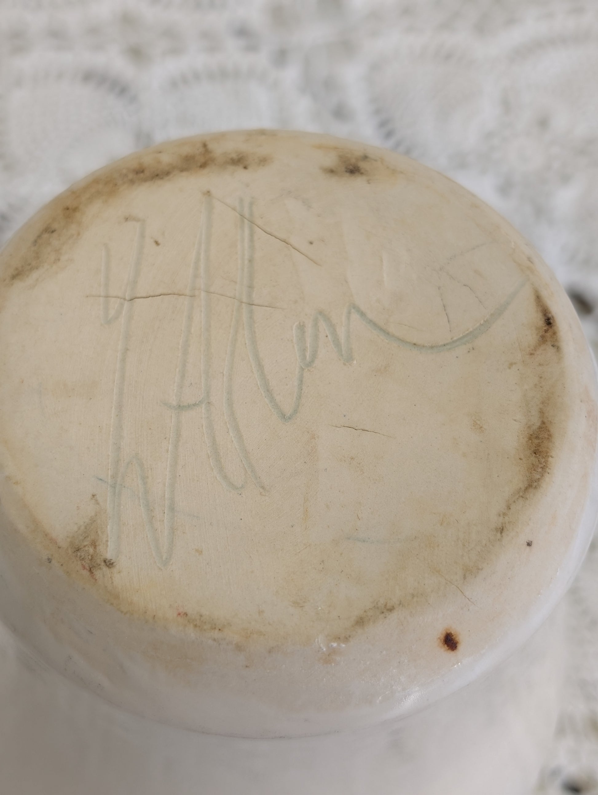 Handmade studio pottery vase with white glaze and blue/gray bands